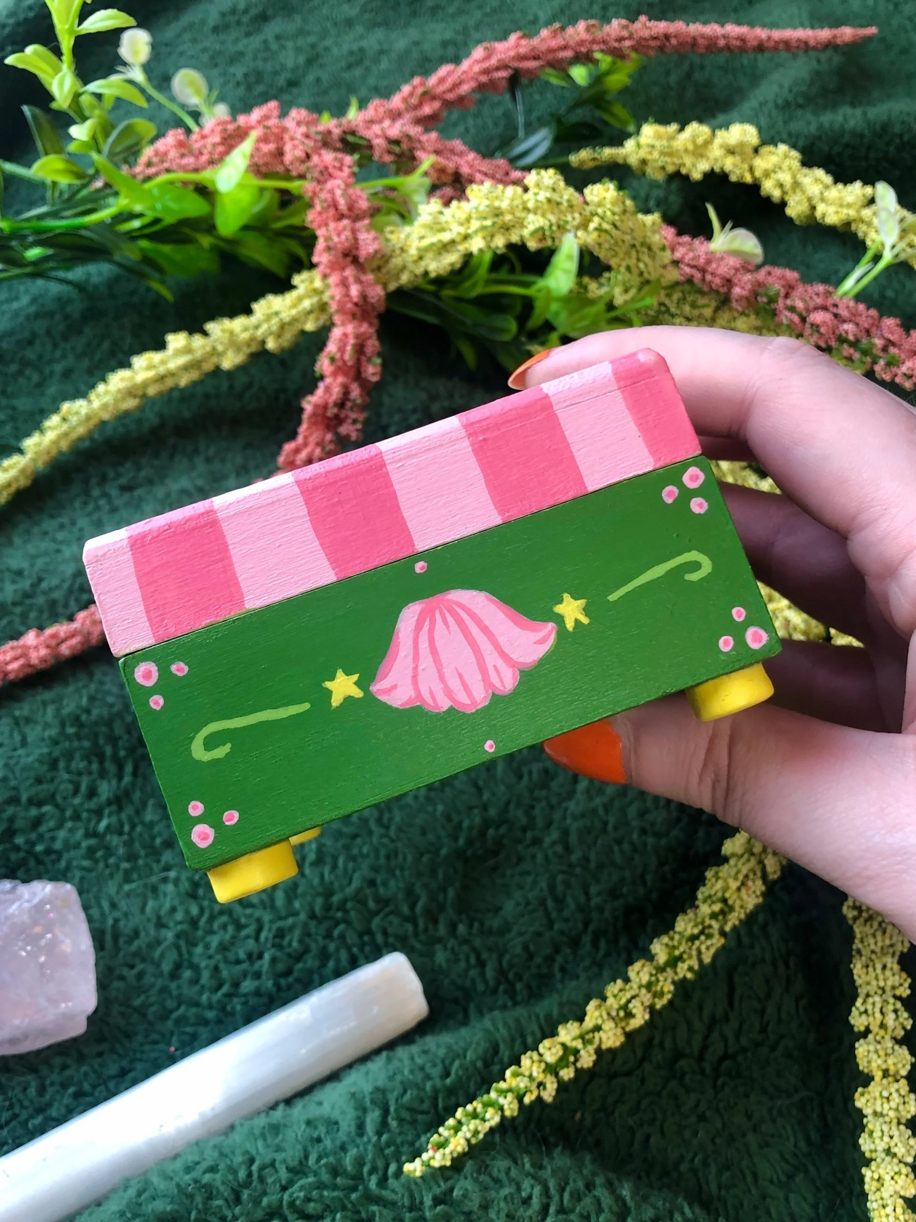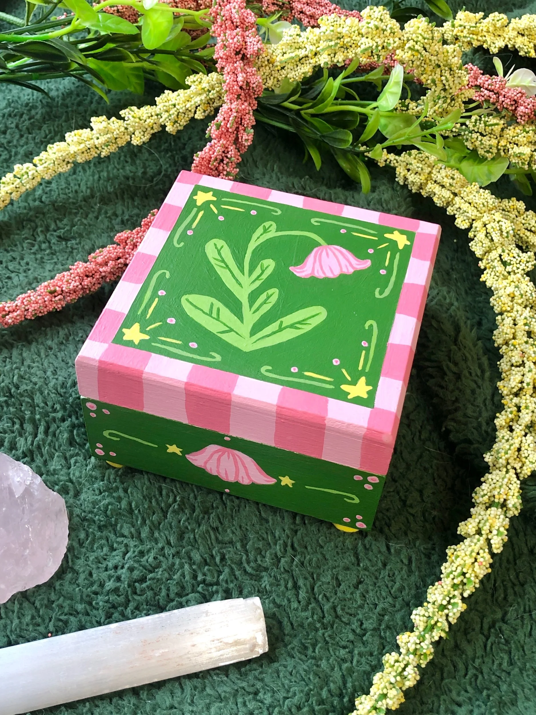 3.5 x 3.5in hand painted springtime inspired wooden trinket box with a magnetic closure.