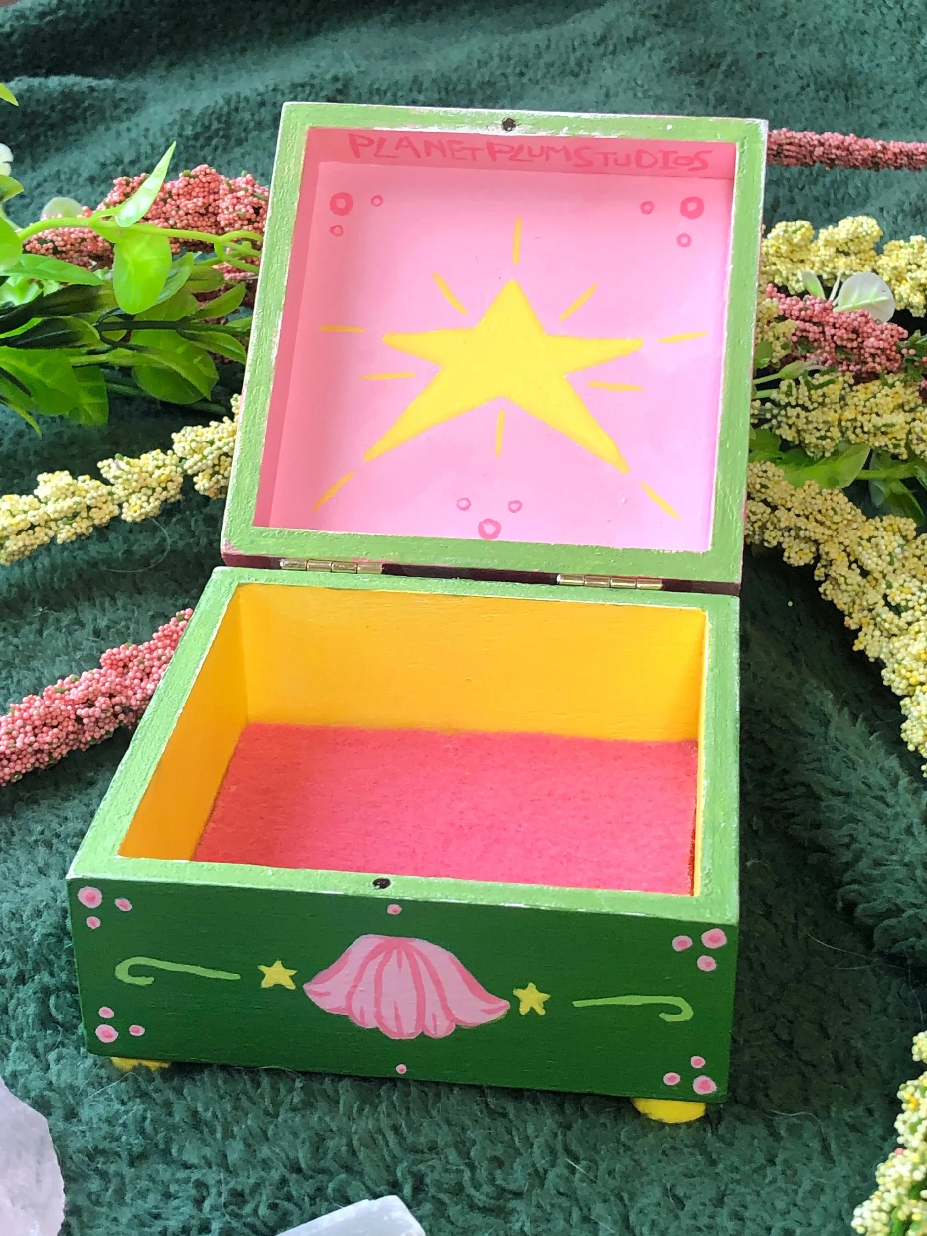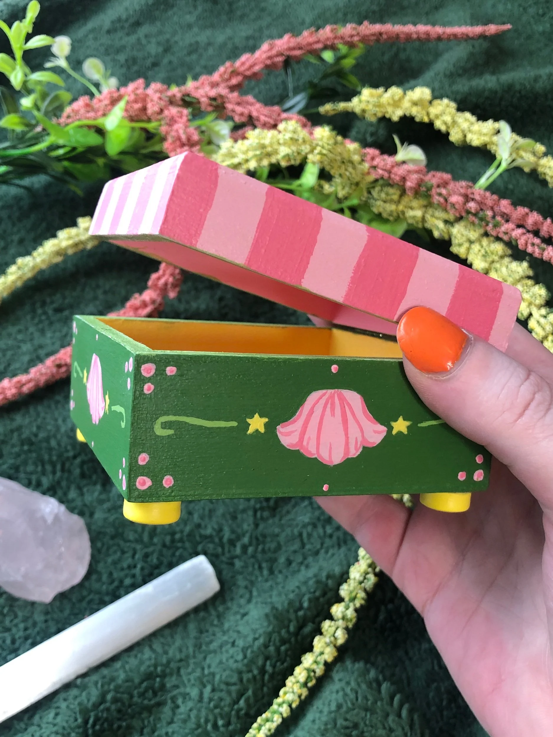 Painted with acrylic paint and sealed with the matte varnish, the feet of the box are made out of polymer clay and painted with acrylic paint.